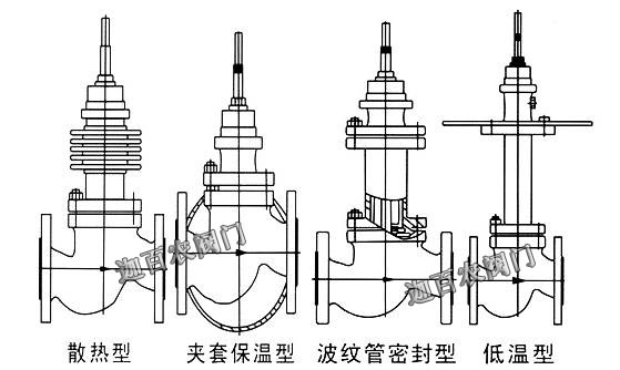 有标准型、调节切断型、波纹管密封型、夹套保温型等品种。产品压力等级有PN1.6 4.0 6.4MPa;公称通径DN20~300mm;适用流体温度有-60~+450℃;按温度高低配用不同阀盖可分常温型、高温型和低温型。 |