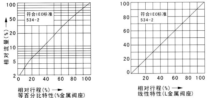 5.通过改变阀芯形状的设计;不同的阀芯窗孔形状会得到不同流量特性值:等百分比(对数)性、直线性。